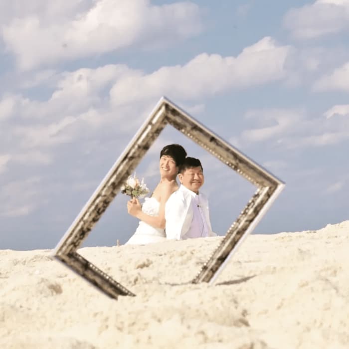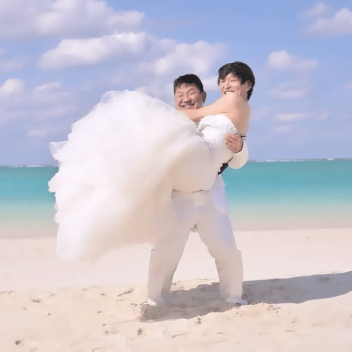 そこには、純白のウェディングドレスに身を包んだジュニアさんと、白いタキシードでビシッと決めた大城さんの姿が。背を合わせて砂浜に座り、こちらに眩しいほどの笑顔を見せています。