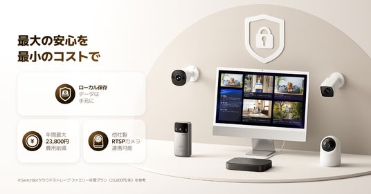 最大1TBのmicroSDカードと最大16TBの外付けHDDに対応。映像はすべて手元に保管されるため、プライバシー漏洩リスクを抑えつつ、クラウド費用も削減します。最大8台のカメラを1台のAIハブで一括管理可能。さらに、HDMIでモニターへ出力すれば、家中の状況を1画面で把握可能です。
