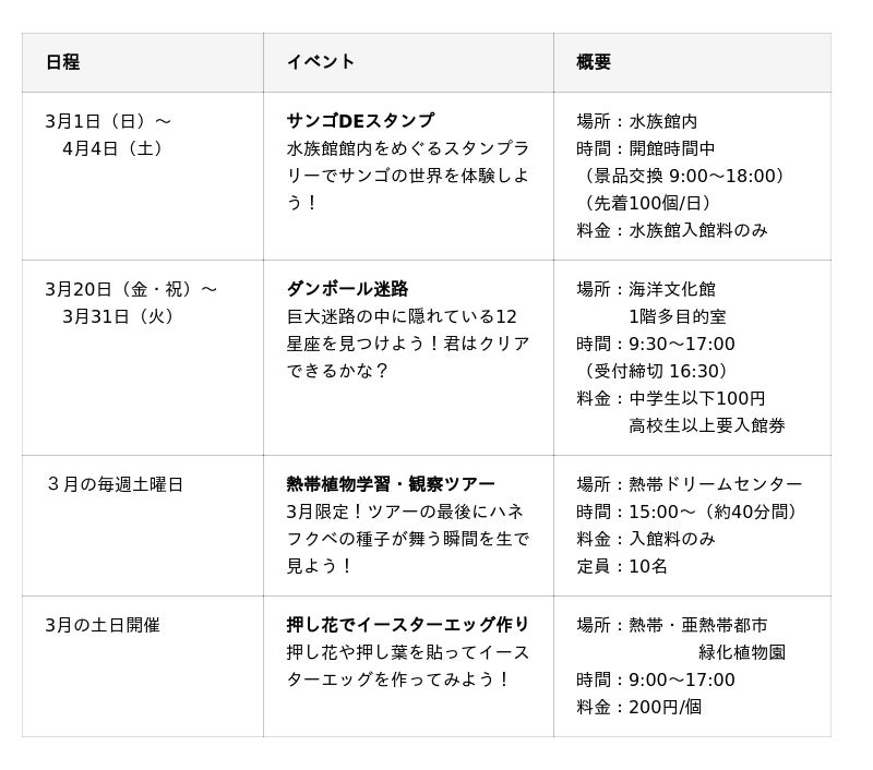 そのほか、多肉植物の寄せ植えやウミガメ飼育体験など、楽しいイベントが盛りだくさん!