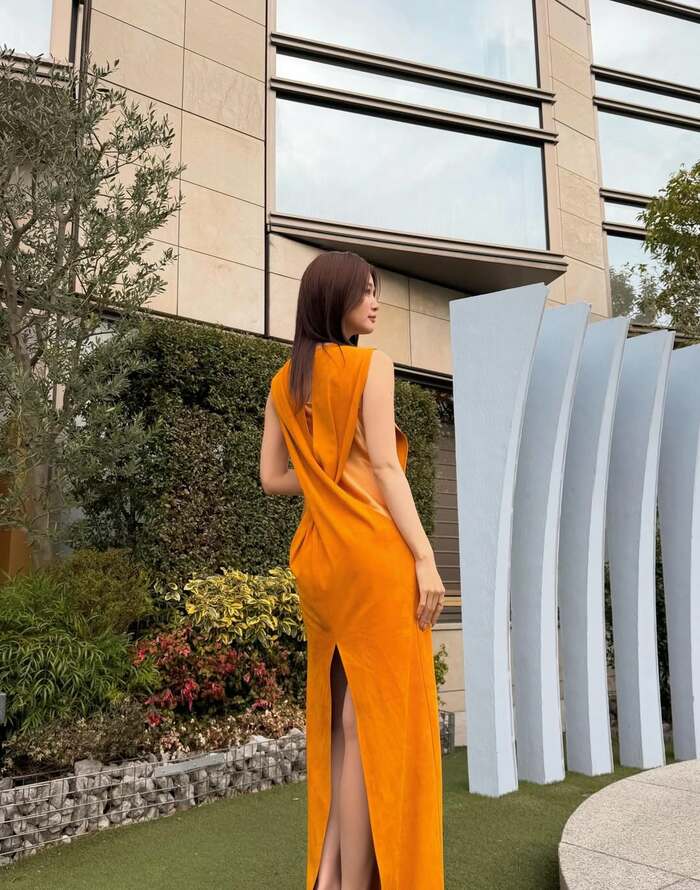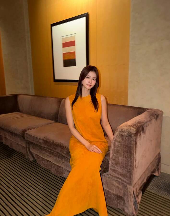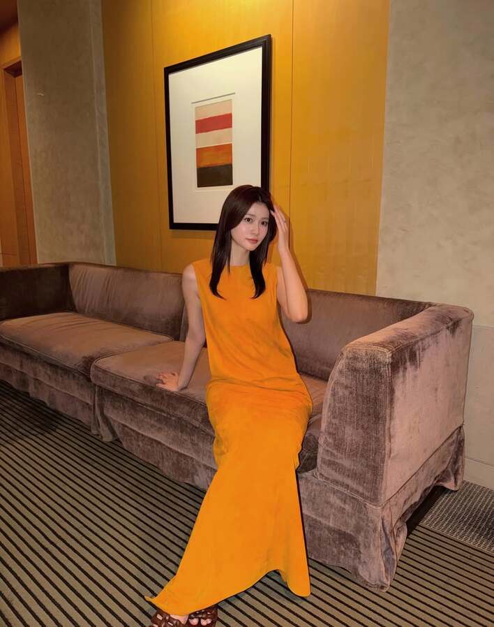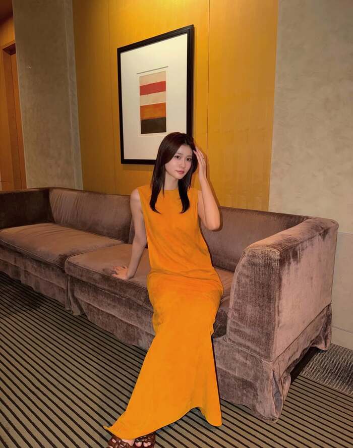 公開された写真を見てみると、オレンジ色のロングドレスを着た生見さんが、ソファに腰掛けている姿が。