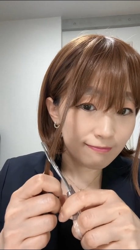 慣れた手つきでウィッグをかぶると、輪郭にかかるサイドの髪と前髪をハサミでチョキチョキ。さすがものまねタレント、細かいところまで抜け目がないです。