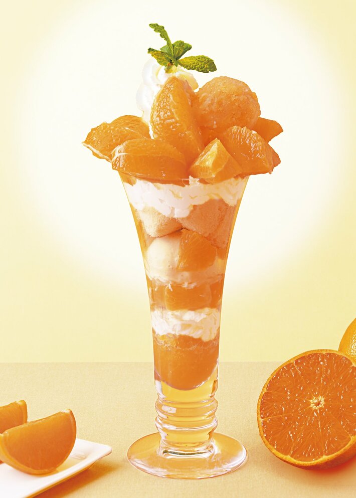 旬の「せとか」を丸ごと1個使用し、自家製せとかのグラニテ(※)とバニラアイス&ホイップクリーム、スポンジ、ゼリーと、カットした「せとか」を層にし、さらにグラスからあふれんばかりに「せとか」を盛りつけました。