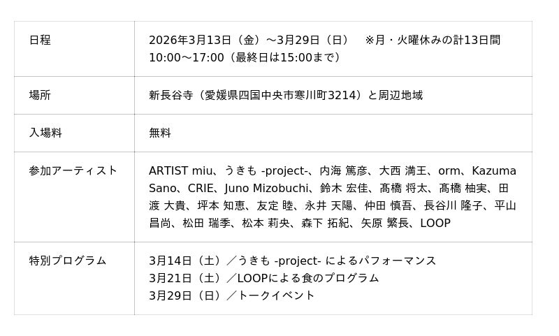 また、3月21日(土)には、愛媛を拠点に活動する料理人ユニット LOOP による食のプログラムを予定しています。 土地や食材、そこに関わる人の存在を大切にしながら、その場所に流れる時間や空気を料理として立ち上げる試みであり、芸術祭の文脈を食の体験へと拡張するプログラムとなります。