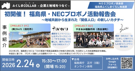 福島県とNECは、2024年2月に「デジタル変革(DX)の推進および県産品の振興等を目的とした包括連携協定」を締結しました(注1)。本協定に基づき、2026年2月19日(木)から3月13日(金)まで、NECグループ社員が参画する「NECグループ ふくしま応援アクション2025」を実施しています。