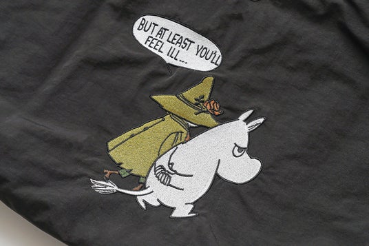 さらに、開口部にはニョロニョロの刻印が施されたスナップボタンを配置。実用性の中に宿る、さりげない遊び心が日常を楽しく彩ります。