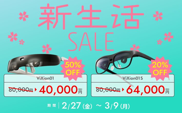 オートフォーカスアイウェア「ViXion01S」を開発・販売するViXion株式会社(東京都中央区、代表取締役社長:南部誠一郎、以下ViXion)は、2026年2月27日(金)より11日間、新生活シーズンに向けた「新生活セール」を開催いたします。期間中、オートフォーカスアイウェア「ViXion01S」および「ViXion01」を特別価格で販売します。