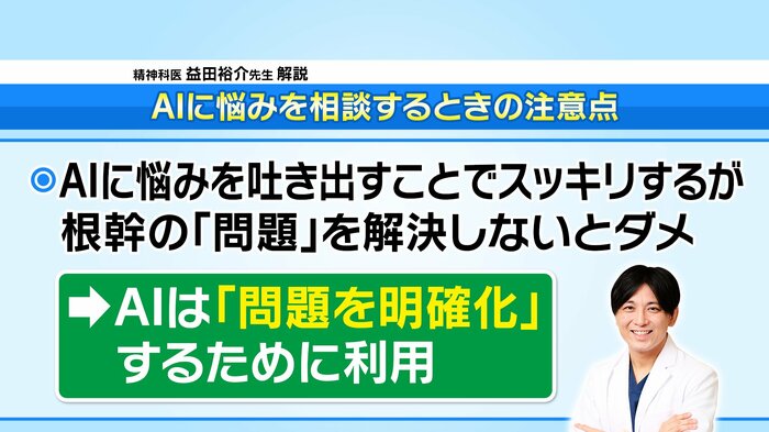 『精神科医が教えるAIメンタルケア入門』という書籍を執筆した精神科医の益田裕介先生は、「悩みを吐き出し、可視化することでラクになるという点では、AIへの悩み相談は有効」と分析しました。