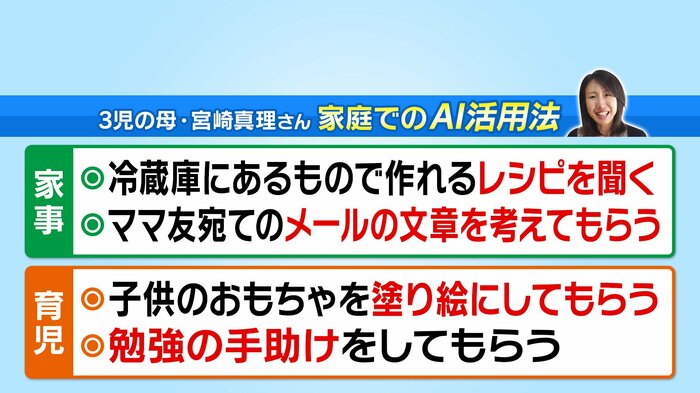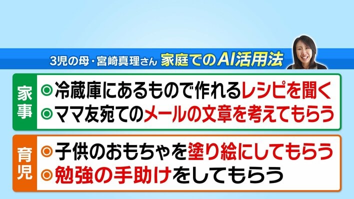 番組では、『AI×家事』という書籍を執筆した3児の母・宮崎真理さんを取材。宮崎さんは、冷蔵庫にある食材からAIにメニューを考えてもらったり、ママ友に送る謝罪メールの文案を教えてもらったりと、AIを日々活用しているといいます。