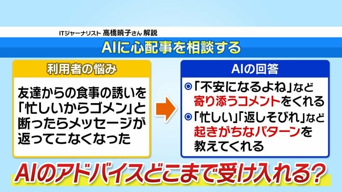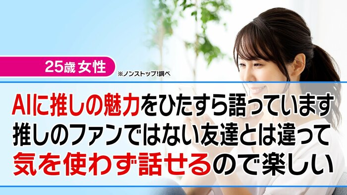 「推しの魅力をひたすら語りたい時に、友だちが相手だと遠慮するが、相手がAIだと気を使わずに話せて楽しい」という、25歳の女性の本音も登場しました。