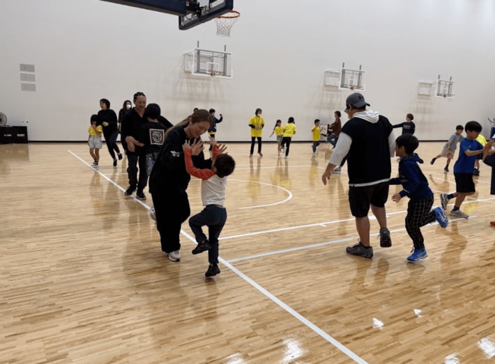この日のスポーツ教室では、ウォーミングアップを行った後、ボールに慣れる動きや簡単なシュート体験、親子やグループで協力するミニゲームなどを実施しました。