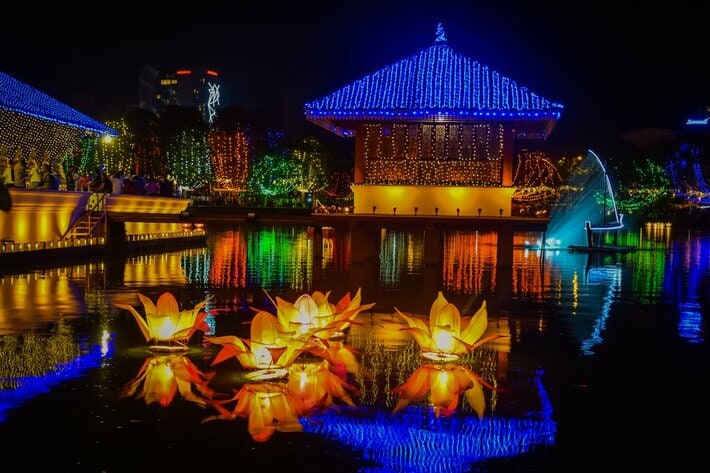 5月の満月の日に行われるヴェサックは、仏陀の誕生・成道・入滅を祝う、スリランカで最も神聖な仏教行事。夜になるとコロンボの街は無数のランタンで彩られ、祈りと光に包まれた幻想的な空間が広がります。宗教行事でありながら市民が一体となって祝うこの祭りは、仏教文化を持つ日本人にも深く響く特別な体験です。