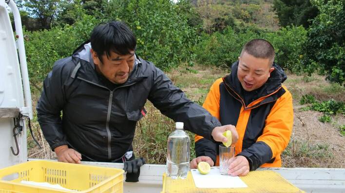 道中、レモン畑を発見し、収穫させてもらえることに。採れたての生口島レモンにかじりつくと、予想に反する甘みにびっくり。