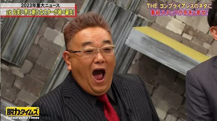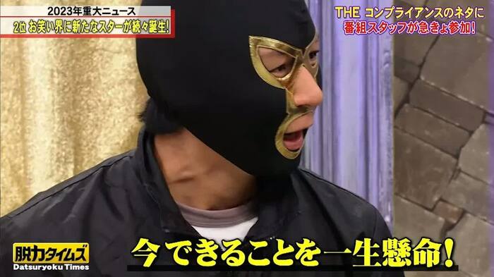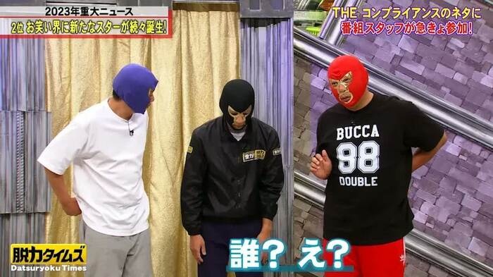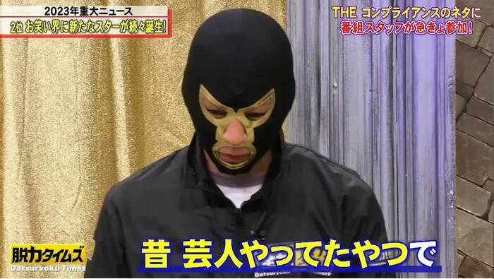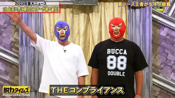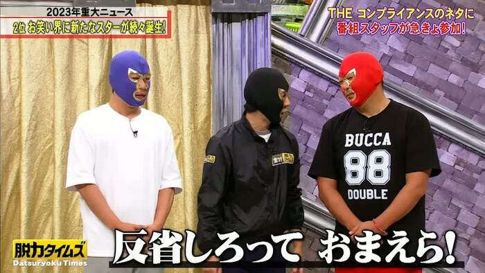 12月8日放送の『脱力タイムズ』で大きな反響を呼んだ、覆面コント芸人のTHEコンプライアンス(TKO/まもる=木本武宏さん?、やぶる=木下隆行さん?)が登場し、「暴力はアカンやろ」「もっと簡単に儲かる方法」などのきわどいワードを使ったコントを披露。