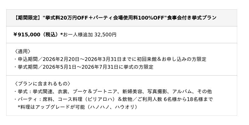 KAHAWAI CHAPEL挙式+アウトリガー・リーフ会食がリーズナブルに楽しめる期間限定プラン!KAHAWAI CHAPELで挙式の後に、アウトリガー・リーフのシェフとともに創作したオリジナルコース料理を、期間限定の特別料金で楽しめるパーティプランが登場。ハワイの食材を使ったコース料理と、オーシャンビューのパーティルームでの極上のひとときは、まさに唯一無二。KAHAWAI CHAPELとアウトリガー・リーフだからこそ実現した、ここでしか体験できないパーティプランです!