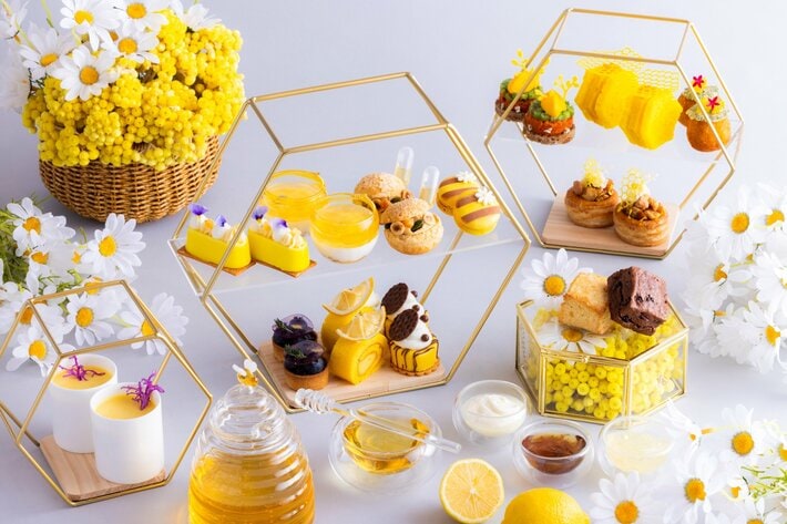 今回のアフタヌーンティーは、はちみつのやさしい甘さとレモンの軽やかな香りが織りなす“春のご褒美時間”がテーマです。口に入れた瞬間にとろけるスイーツ9種類と、素材の旨味を生かしたセイヴォリー5種類を、はちみつの世界観を象徴する6角形ハニカムスタンドに並べ、まるでハチが舞う春の花咲くガーデンを眺めているかのようなわくわく感を演出します。春の訪れを感じる鮮やかなスプリングイエローで統一されたスイーツとセイヴォリーは、見た瞬間に心がときめき、ひと口で笑顔溢れるラインアップ。この季節だけの贅沢なアフタヌーンティーを、心ゆくまでご堪能ください。