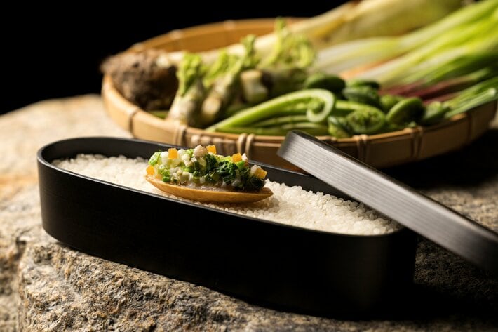 岩手の「うこぎのほろほろ」から着想を得た、春の山菜を楽しむ前菜