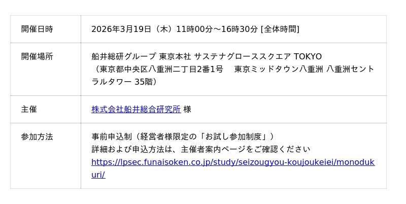 株式会社テクノア(本社:岐阜県岐阜市、代表取締役:山崎 耕治 以下、テクノア)の代表取締役 山崎が、2026年3月19日(木)に、株式会社船井総合研究所 様(東京本社:東京都中央区、代表取締役社長 社長執行役員:真貝 大介 様)が主催する「ものづくり経営研究会」内で実施される講座に登壇します。
