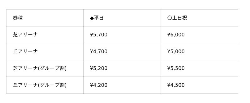※芝アリーナは芝生の上に座ってご覧いただくお席です。丘アリーナは、椅子にお座り頂くお席です。