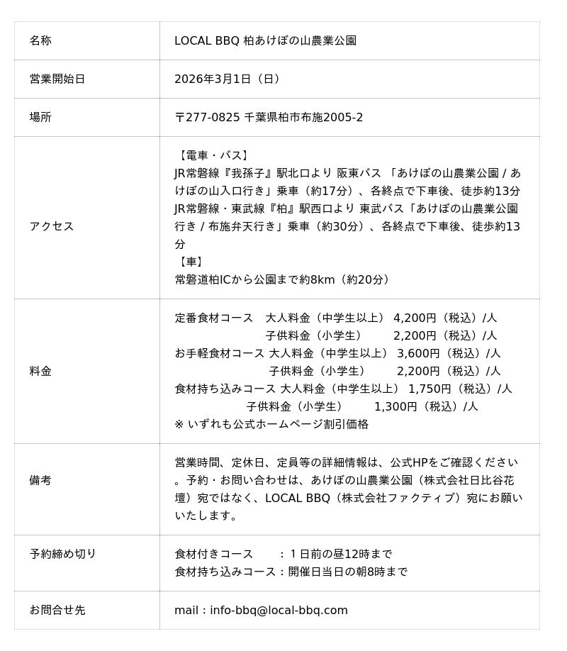 【URL】LOCAL BBQ 柏あけぼの山農業公園 : https://local-bbq.com/kashiwaakebonoyama