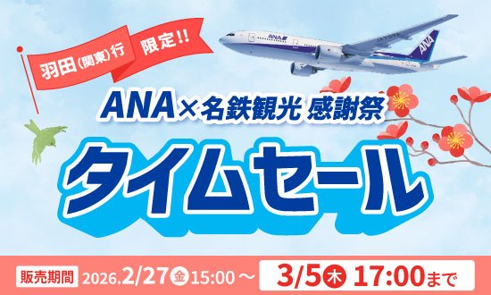 名鉄観光サービス株式会社(本社:愛知県名古屋市、代表取締役社長:岩切道郎)は、2026年2月27日(金)より3月5日(木)までの期間限定で、ANA利用をする羽田到着のツアー商品を対象とした「ANA×名鉄観光感謝祭 タイムセール」を開始いたしました。