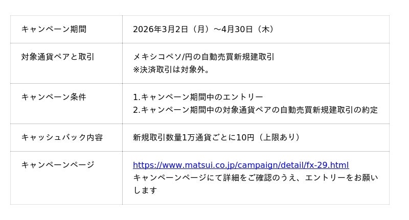 松井証券株式会社(本社:東京都千代田区、代表取締役 社長執行役員:和里田 聰、以下「当社」)は、2026年3月2日(月)取引分より、FX(外国為替証拠金取引)サービスにおいて、メキシコペソ/円の通常スプレッドを0.3銭から業界最狭水準(※1)の0.2銭に縮小いたします。また、メキシコペソ/円を含む高金利通貨ペアを対象としたキャッシュバックキャンペーンを、同日3月2日(月)より開催いたします。