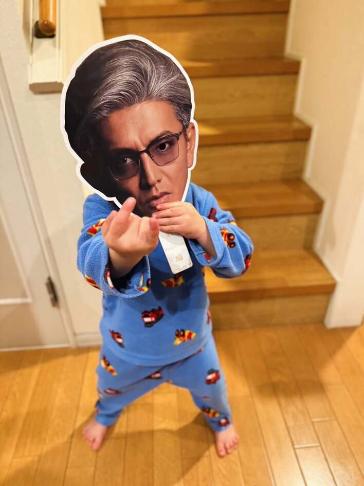 青地に車のモチーフが散りばめられたかわいいパジャマを着ていますが、その顔には木村拓哉さんの顔がプリントされた大きなお面がつけられています。こちらにまっすぐ指を突きつけるポーズと、お面の鋭い眼光からは、ただならぬ緊迫感が伝わってきます。