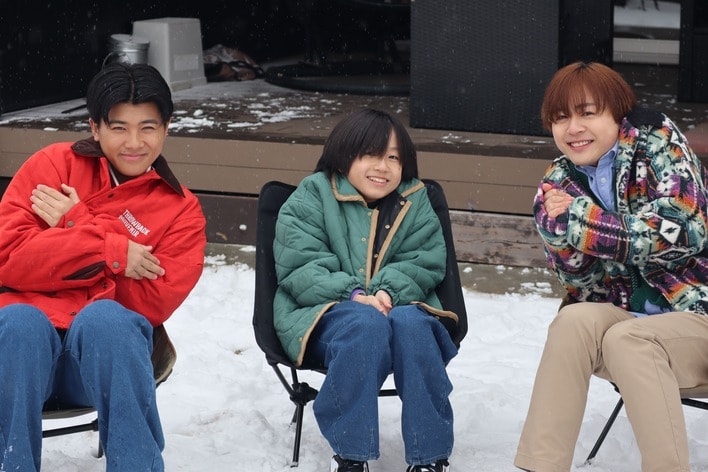 熱海の商店街に到着すると、食べたいものを言い合って盛り上がり、キャンプ場では、テラスに積もった雪を投げ合うなど、まるで兄弟のように無邪気に旅を満喫。