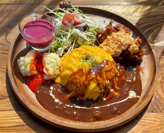 ・ プレミアムオムライスセット:朝採れ卵を贅沢に使った一皿。とろっとした口当たりのオムライスに、自家製タルタルたっぷりのチキン南蛮を添えた、卵づくしの満足セット。