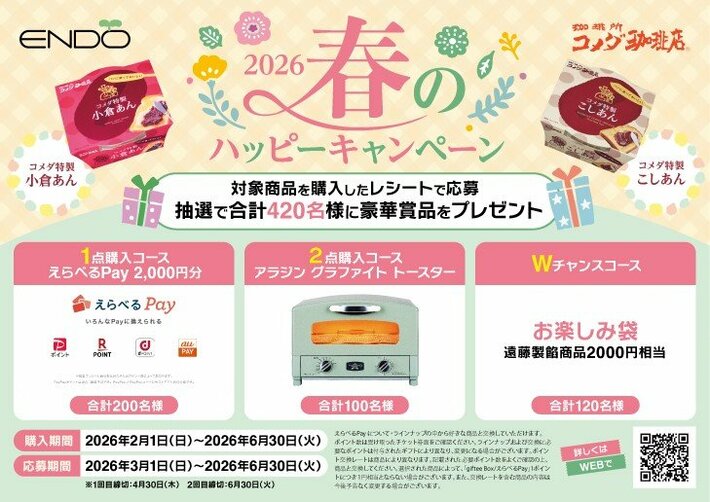 株式会社遠藤製餡(本社:東京都豊島区、代表取締役:遠藤岳)は、2026年3月1日より「コメダ特製小倉あん ・ こしあん ハッピーキャンペーン2026」を期間限定で開催します。