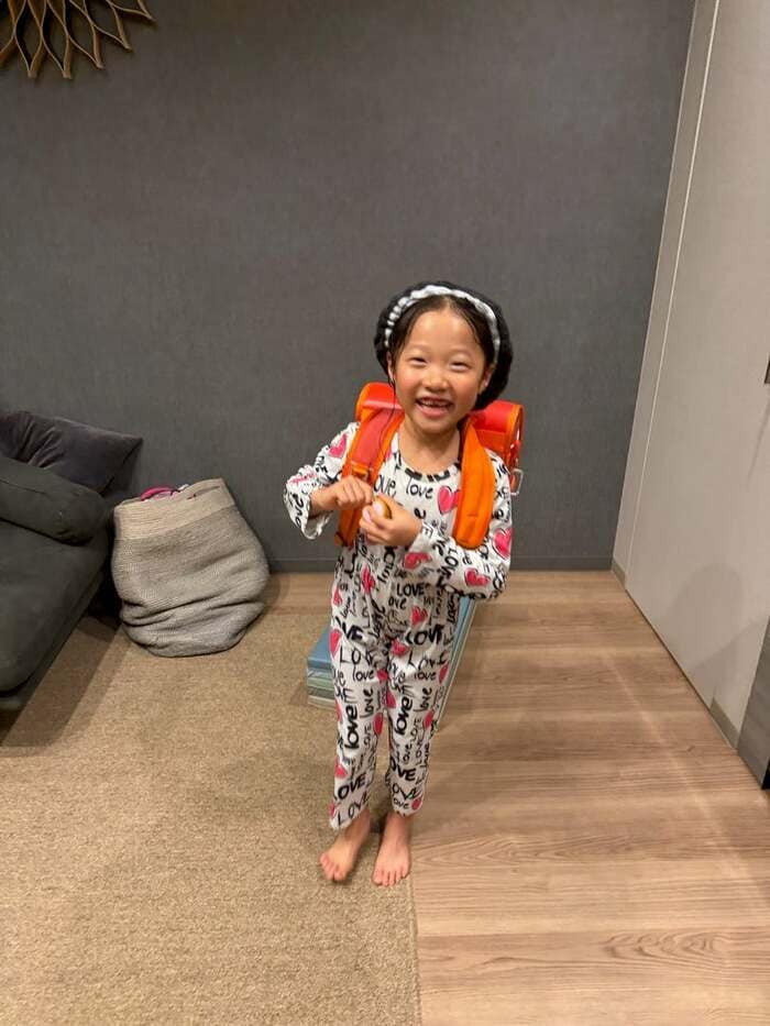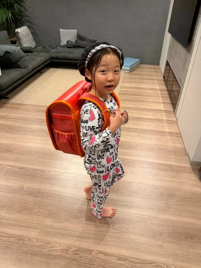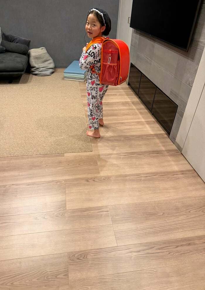 広々リビングでの6歳長女のランドセル姿に「楽しい練習になりましたね」