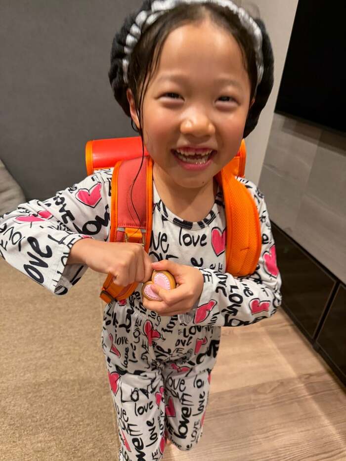 最後は「ビーーーーー」と、ランドセルの肩ベルトに付けていた、防犯ブザーの栓を抜くようなしぐさを見せるこうめちゃん。