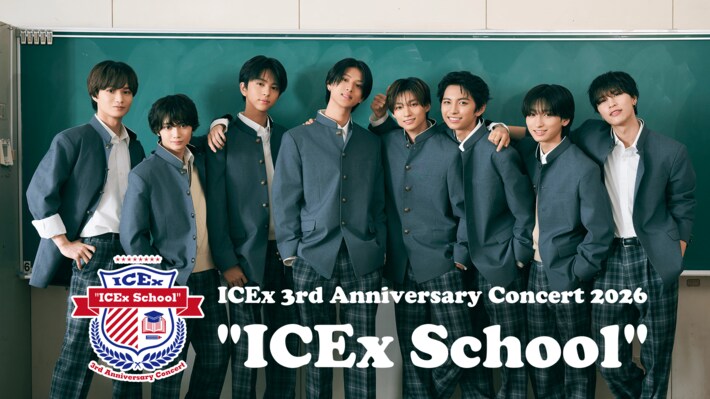 "全ての愛を愛す"をコンセプトに活動する、EBiDAN発、志賀李玖・中村旺太郎・阿久根温世・千田波空斗・筒井俊旭・山本龍人・竹野世梛・八神遼介からなる8人組ダンスボーカルユニットICEx(アイス)。3月に結成3周年を迎えるICExの、グループ最大規模の3周年記念コンサート「ICEx 3rd Anniversary Concert 2026 "ICEx School"」が3月22日(日)にパシフィコ横浜 国立大ホールにて開催されます。U-NEXTでは、この模様を独占ライブ配信することが決定いたしました。見切れ席も含め全席チケットソールドアウト済みとなった期待の公演を、ぜひU-NEXTならではの高音質・高画質な映像でお楽しみください。