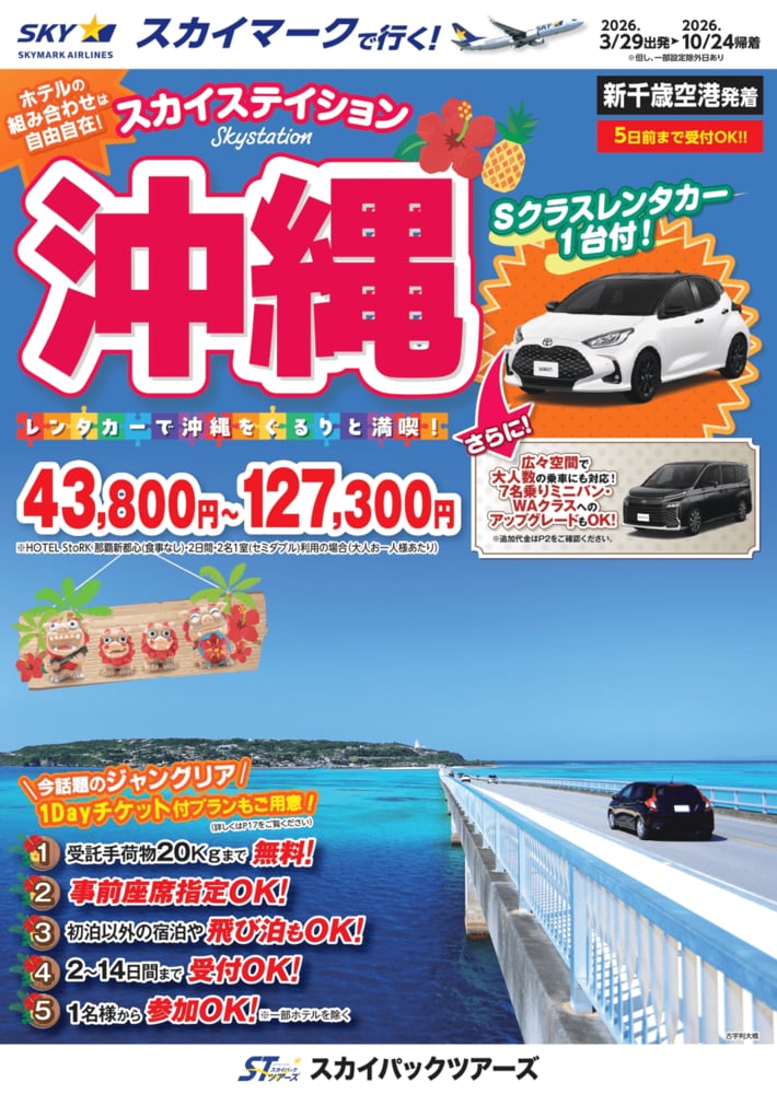 スカイパックツアーズ株式会社(本社:東京都中央区、社長:横山正巳)は、スカイマークを利用した価格固定型のパンフレット旅行商品「スカイステイション レンタカー付沖縄」【新千歳空港発着】(2026年3月29日出発~2026年10月24日帰着)の販売を開始します。スカイマークだけを取り扱う専売店だからできるスペシャルプライス!早めのご予約がお得です。