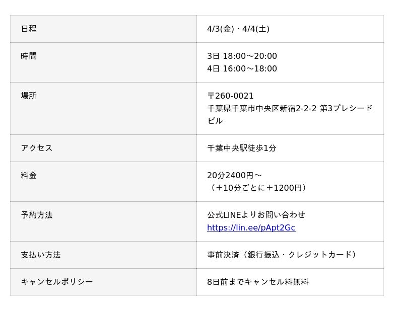 占い師養成CAMPの説明会と同時に、くるとん先生の対面鑑定も千葉で行います。すでにご予約いただきました方、誠にありがとうございます。くるとん先生が千葉で鑑定される貴重な機会になりますので、奮ってご参加ください。