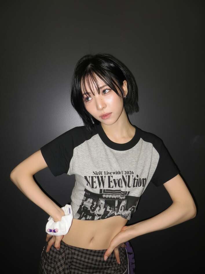 着用しているのは、NiziUのグッズと思われるTシャツ。その裾をさりげなくまくり上げ、引き締まったお腹をのぞかせています。ほっそりとした美しいくびれは思わず目を引くほどです。