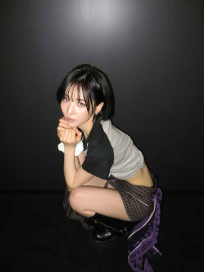 続く写真では、黒一色の背景の中で膝を屈めて腰を落とし、両手を顎の下で組むポーズを披露。先ほどのトップスにチェック柄のミニスカートを合わせたコーディネートで、すらりと伸びた美脚が際立っています。