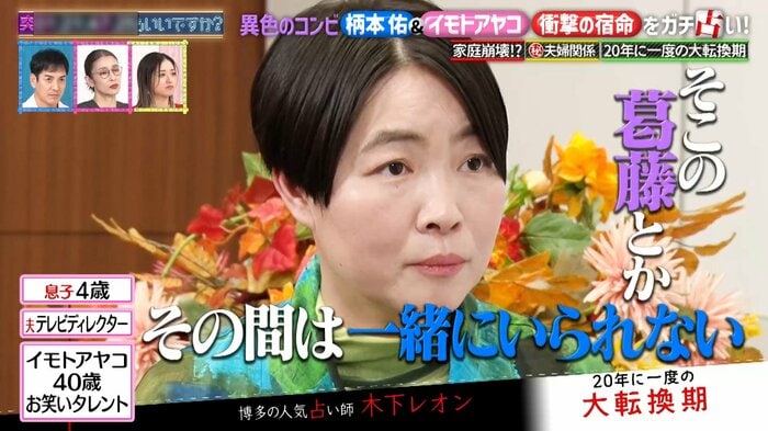 レオンさんは、葛藤が原因で感情の起伏が激しくなり、言ってはいけない一言を夫に発することで家庭崩壊につながると告げ、イモトさんは「恐ろしい」と戦慄。さらに2026年のイモトさんは仕事運が最高に良いため、家庭どころではなくなる運命だそう。