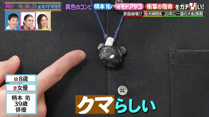 そして「誰かに突っ込まれるまで言わないでおこうと思ってたけど…」と切り出すと、「実はこれ、うちの娘が誕生日に作ってくれた」と、身につけていた熊モチーフのペンダントを指してニコニコ。
