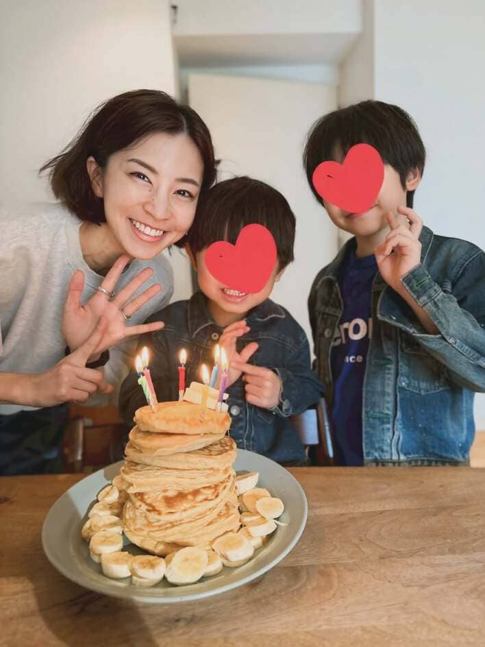 写真では、高く積み上げられたパンケーキタワーを囲む安田さんと二人の子供たちの姿を披露。黄金色に焼かれたパンケーキの周りにはバナナの輪切りが飾られ、中央で揺れるろうそくの炎が温かい雰囲気を演出。カメラに向かって、安田さんと次男は手で「6」を表現。長男はその隣でピースサインを見せており、家族の喜びと幸せがぎゅっと詰まった瞬間が切り取られています。