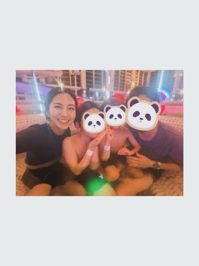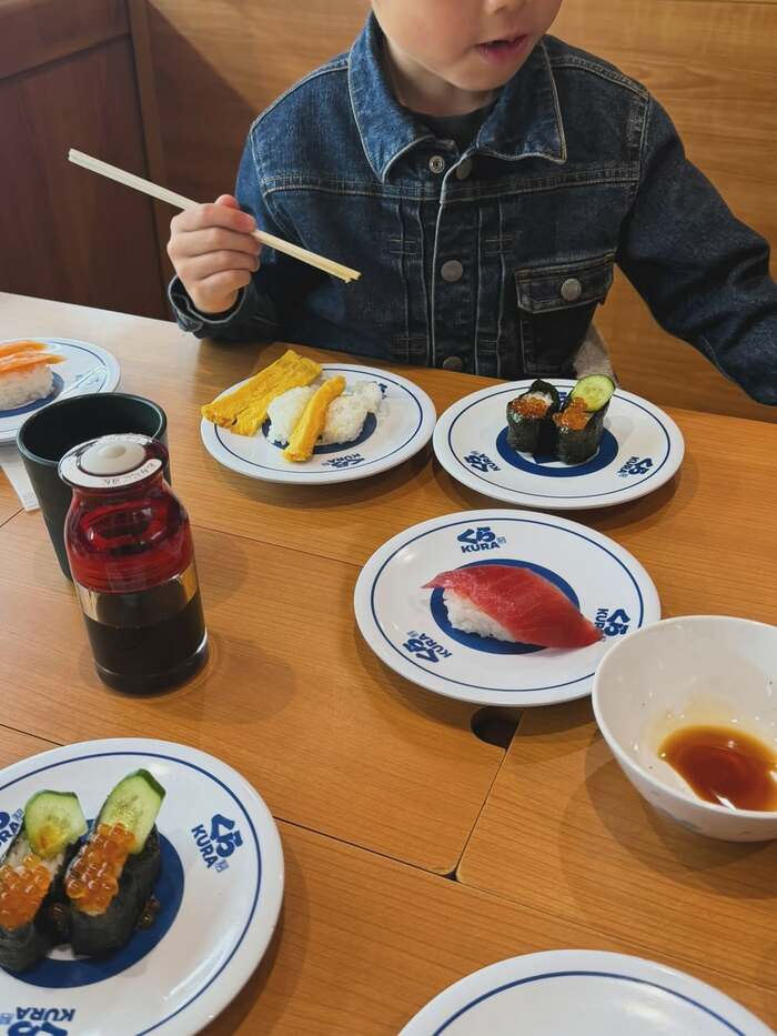 プールを満喫した後は、「近くのくら寿司に寄って帰りました!」と、回転寿司で食事を楽しんだことも報告。デニムジャケットを着た息子が、お寿司を箸でつまむ一場面が収められています。