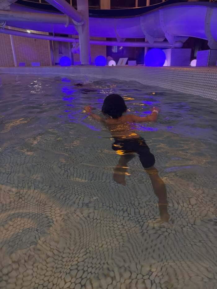 投稿された写真では、青紫の照明が幻想的な屋内プールで、気持ちよさそうに泳ぐ子供たちの様子や…