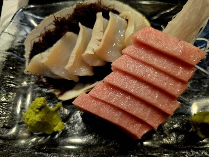 見るからに新鮮なミル貝と、ツヤツヤと輝く中トロに食欲をそそられます。「トロトロ 旨い!!!ミルミル旨い!!!」とテンションの上がった高橋さんは、「照り焼きソースのステーキをオーダー」と魚介だけでなくお肉まで注文!