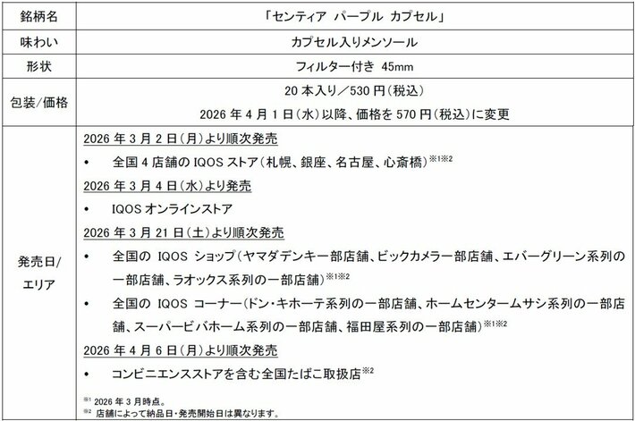 フィリップ モリス ジャパン合同会社(本社:東京都千代田区、社長:シェリー・ゴー、以下「PMJ」)は、加熱式たばこ「IQOS ILUMA(イルマ)」シリーズ専用たばこスティック「SENTIA(センティア)」では初となるカプセルを搭載した「センティア パープル カプセル」を、2026年3月2日(月)より、全国4店舗のIQOSストア※1※2、2026年3月4日(水)より、IQOSオンラインストア、2026年3月21日(土)より、IQOSショップ(ヤマダデンキ一部店舗、ビックカメラ一部店舗他)※1※2、IQOSコーナー(ドン・キホーテ系列の一部店舗他)※1※2、2026年4月6日(月)より、コンビニエンスストアを含む全国のたばこ取扱店※2にて順次発売いたします。