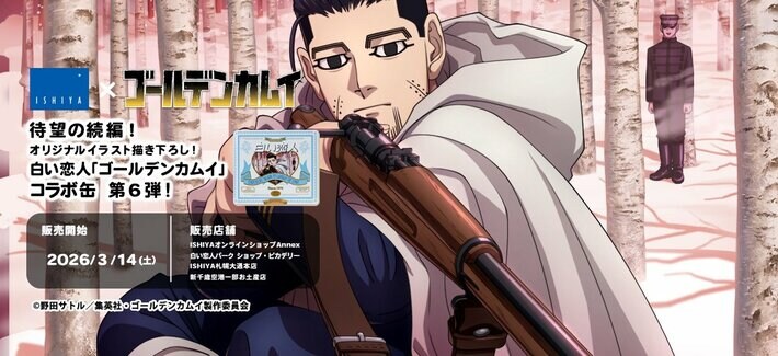 石屋製菓株式会社、並びに石屋商事株式会社(本社:北海道札幌市西区 代表取締役社長:石水 創)は、北海道を舞台に冒険活劇が描かれるTVアニメ『ゴールデンカムイ』とコラボレーションし、2026年3月14日(土)に白い恋人36枚入『ゴールデンカムイ』コラボ缶を数量限定で販売いたします。