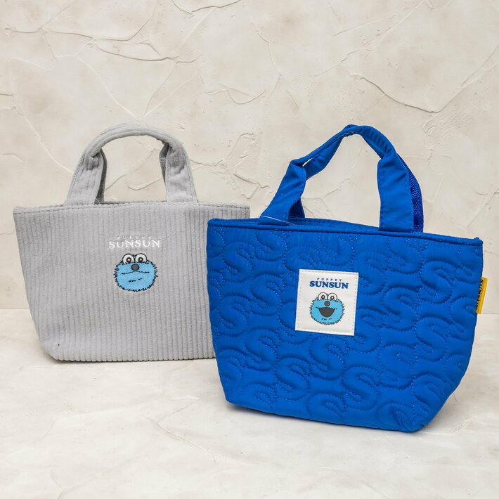 「キルティング生地ランチバッグ」は、鮮やかなブルーの生地に「S」の字のステッチを施し、中央に「スンスン」のワッペンをあしらったポップなデザインです。