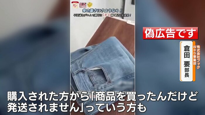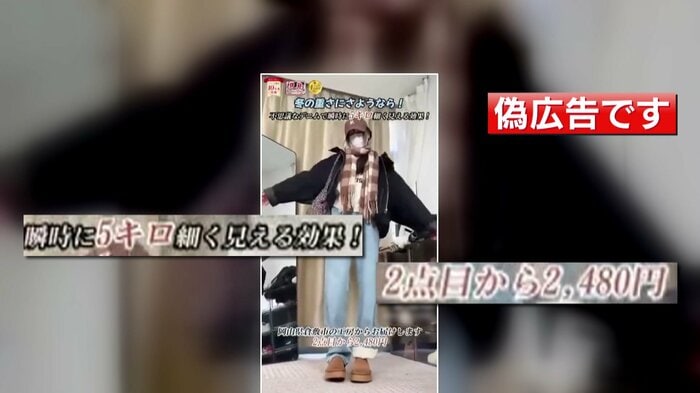 「瞬時に5キロ細く見える」「2点目から2480円」など、目を引くうたい文句が並ぶ、偽の広告。