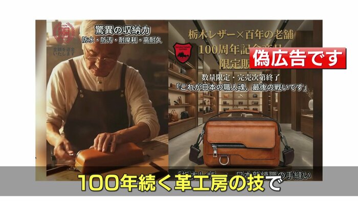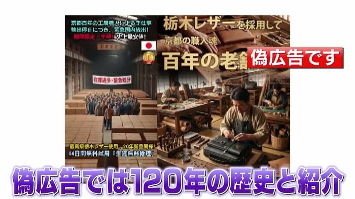 「栃木レザー」は創業89年。偽広告では「120年の歴史」と紹介された上、会社をたたむので「職人の給与を支払うために買ってほしい」などと、でたらめの内容まで…。