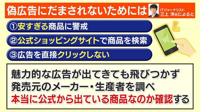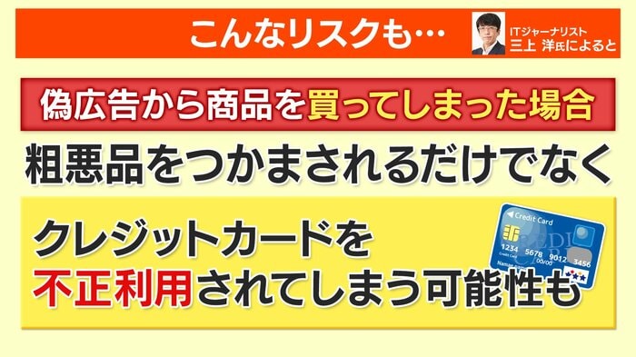 ITジャーナリストの三上洋氏によると、偽広告から商品を買ってしまった場合、粗悪品をつかまされるだけでなく、クレジットカードを不正利用されてしまう可能性もあるといいます。