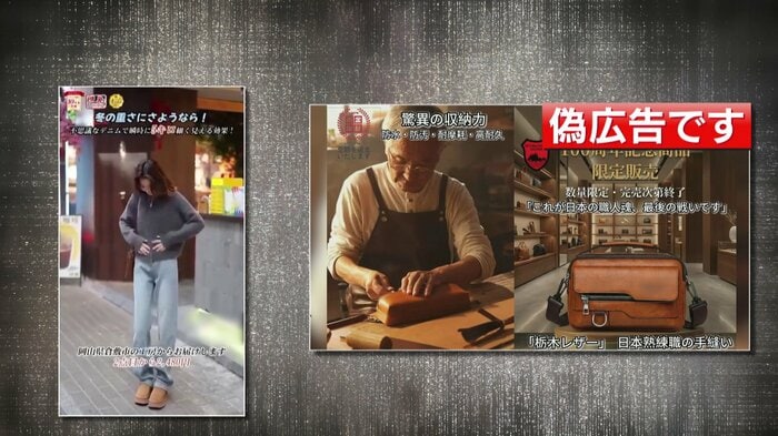 偽広告をよく見ると、不自然な日本語が使われているなど“違和感”だらけ。