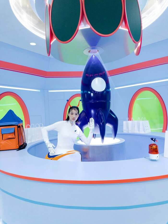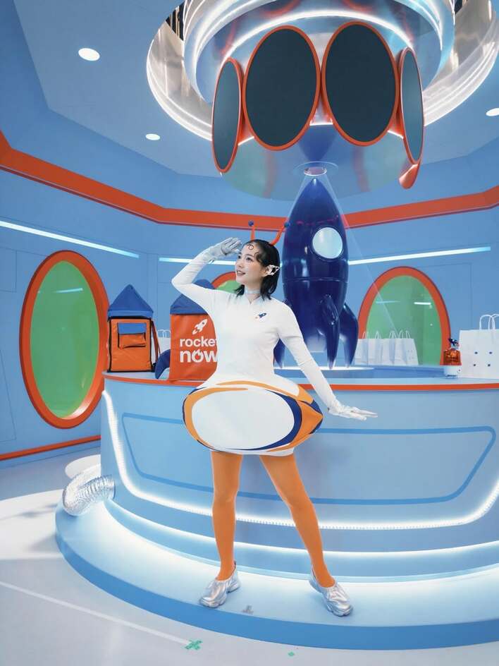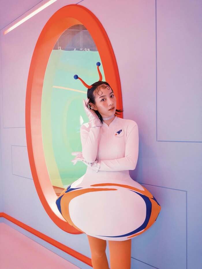 かなり奇抜なスタイルで、上半身は真っ白、下半身はオレンジタイツ、そして宇宙ロケットを模したような立体的な洋服がお腹周りを包んでいます!